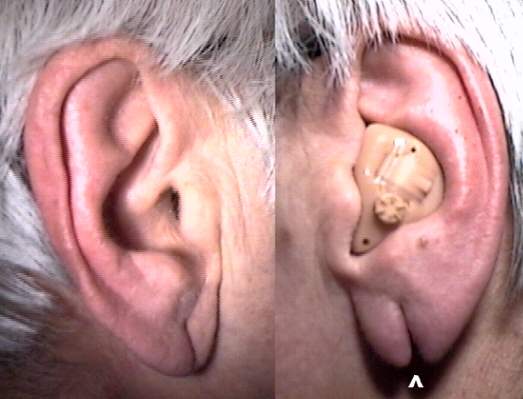 This 83 year old female patient, known to the practice for two years, was seen for a routine service visit on her CLASS II full concha hearing aid. A bifid lobule, not present two months earlier, was noted on the left, aided ear. The patient indicated that this condition had its origins with ear-piercing in infancy. In older adult years continued wearing of pierced-type earrings resulted in a progressive atrophy of lobular epithelial tissue, inferiorly. One month ago, the left lobule opened inferiorly with the atraumatic removal of an earring. The right lobule remains intact with an 8 mm elongated perforation.