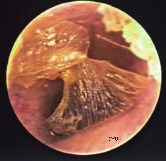 The adult male patient was seen with a chief complaint of an inability to insert his custom hearing aid to its normal full depth. The web of desquamation shown in the image below was found to be adherent to the walls of the antero-inferior and postero-superior surfaces of the external auditory meatus. Hearing aid canal tip pressure on the web resulted in discomfort at the desquamation points of attachment. The patient was referred for appropriate ENT medical action which solved the problem.