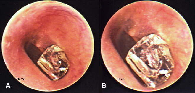 Figures A and B represent two different observation depths of video otoscopy in the ear canal. The images display the left ear of an adult male patient involved in a severe automobile accident. The vehicle rolled over, shattering the windshield. Several days after the accident, the patient was seen with a chief complaint that his left ear "did not feel quite right". Video otoscopy revealed the presence of a windshield glass fragment lodged just lateral to the left tympanic membrane. Audiometry and tympanometry on that ear were within normal limits. The patient was referred for (ENT) medical consultation with atraumatic removal of the artifact.