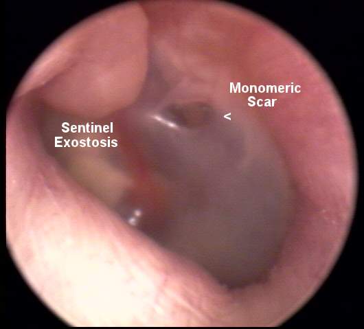 The video oto-macroscopic (VOM) image [inline below (24k)] shows the post-auricular mastoid bowl and scar not atypical of this surgical procedure. Video Oto-Endoscopy (VOE) shows an intact bony EAC with a dull, thickened tympanic membrane. A small monomeric scar, probable site of paracenteses, is located postero-superiorly on the TM.