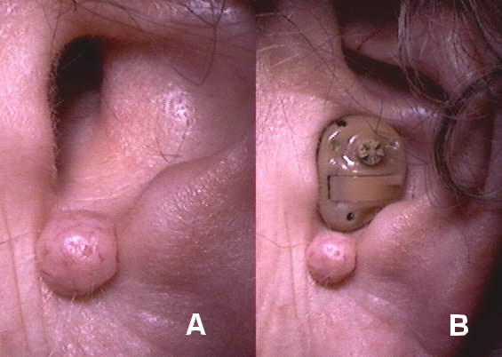 The physician felt there was no contraindication to canal hearing aid use in the affected ear. Care was taken in morphological specification of a replacement canal hearing aid to avoid physical contact with the growth.(B)