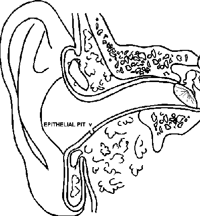 This AD EAC image [inline below (20k)] was obtained from an 86 year old female patient. A candidate for a CLASS II canal hearing aid in that ear, a 2mm diameter epithelial pit was noted in the floor of the cartilaginous EAC. The pit was 5mm deep and filled with cerumen. The line drawing [inline image below (9k)] shows the location of the non-infected pit on the inferior surface of the lateral EAC. ENT consultation was sought re implications for hearing aid use and aural hygiene.