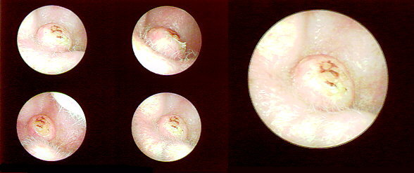 The patient is a 61 year old man with a 6 week history of a painful, progressively expanding mass in his right ear. Its growth had stabilized over the last 2 weeks. Physical exam revealed a 1 cm smooth, raised mass which was centrally ulcerated and umbilicated located posteriorly and inferiorly in the concha. It measured 11mm x 6mm x 4mm.