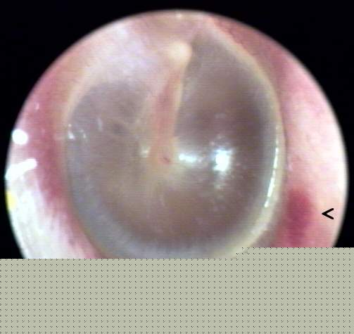 This wry-witted 87 year old female patient [listing her occupation on the intake form as 'domestic engineer'], known to the practice for three years, was seen for a periodic follow-up evaluation. She had been wearing CLASS III ITE hearings aids binaurally with recently noted reduced effectiveness on AD. VO examination revealed a +3 cerumen accumulation in the affected ear. With the referring PCP's approval, an ENT referral was made for cerumenectomy. Because of the deep canal cerumenous impaction and friable canal epithelium, curettage extraction was effective but resulted in a sizeable hematoma on the deep anterior canal wall [inline image below (19k)]. Audiological re-evaluation verified restored effectiveness of the AD fitting.