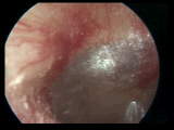These 5 second motion video otomacroscopy ( MVOM) samples resent a view of a 58 year old male right tympanic membrane during tympanometry. The patulous pars flaccida was ejected at the outset of recording from a prior tympanometric trial. The GS 33 Middle Ear Analyzer was set to run from +400 daPa though -600 in the 600/200 daPa/s mode. MVOM and tympanograms were video-captured 15 f/s seriatim. The time lines between video are tympanometry are only roughly coincident. The negative slope of the tympanogram corresponds to the period of rapid pars flaccida ejection. It is possible to open to open simultaneous MS MEDIA PLAYERs and run both tympanogram and TM views concurrently. The Windows 98 MEDIA PLAYER defaults to a single player. To activate a new player with each .avi file, 1) Click on the tympanogram thumbnail image; 2)This opens MS MEDIA PLAYER; 3) Click on view / options / player / "open new player...". 4) Click on the TM image and bring the other MEDIA player up from the task bar. 5) Move both MEDIA PLAYERs together to appreciate the tympanogram/TM dynamic relationship. Pseudo-synchronization of the MVOs is chance, at best. Remember to close the Media Players when finished. You may wish to restore Media Player to its default (single player) status. |