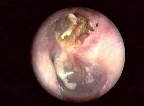 This 20 year old male patient presented with a unilateral 35 dB conductive hearing loss overlay. Video otoscopic examination revealed yellowish keratin debris in Shrapnell's area (pars flaccida) of the AS tympanic membrane, surrounded by "attic cerumen" often a characteristic sign of attic cholesteatoma. Keratin plaque is noted in the posterior inferior quadrant.