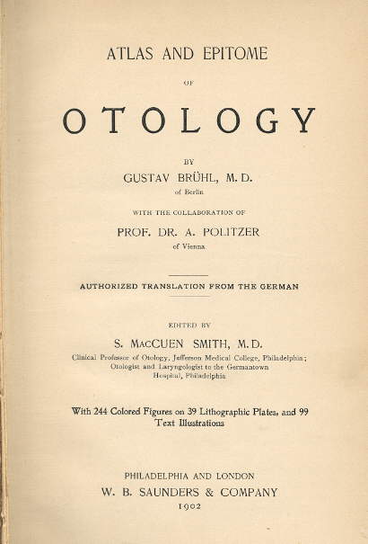 Image and text preparation for Internet presentation by Roy F. Sullivan, Ph.D. Publication of the English version of the 1890s German Bruhl-Politzer atlas (Lehmann) in 1902 (Saunders) represented a landmark in the both detailed color graphic depiction of otic anatomy and pathology and, then state-of-the art, medical-surgical treatment of ear disease and defects. The original text has been a treasured possession since my undergraduate days in the 1950s. Of the thirty-nine color lithographic plates, (Lith. Anst. F. Reichhold, Munchen), four are of historic interest to the student and practitioner of otoscopy, video and otherwise. Plates 15 and 16 each contain macrographic shaded color lithographs of six cases each of "diseases of the auricle (five from Politzer)...". The remainder from Dr. Bruhl. Plates 38 and 39 each contain twenty-four 1/2" X 3/4" shaded color lithographic vignettes, according to Dr. Bruhl's prefatory remarks, from "..flash-light pictures taken from patients in my polyclinic, and slightly enlarged." The Internet author has reproduced a segment this significant work in the history of otoscopy so that colleagues may more fully appreciate the value of video otomacroscopy and otoendoscopy as a clinical tool. Images were captured using a 1200X1200 dpi optical resolution scanner. Graphic files were saved in native 24 bit color bitmap (.bmp) format. Post scan image processing and preparation for Internet presentation were carried out using Ulead MediaStudio Pro; Corel PhotoPaint 8; LiveImage Pro; Caere Omnipage Pro 8 and MS Wordpad. Images were ultimately converted and saved in .jpg format. Considerable graphic enhancement was required to offset the literally postage- stamp size of the tympanic membrane pathology figures. Significantly less processing was required for the pinna pathology lithographs. Images are best viewed with the 800 X 600 pixel resolution recommended for the entire Video Otoscopy site. The browser MUST be capable of supporting FRAMES. Each lithograph is reproduced as an imagemap with either 6 or 24 anchor segments. Click on any segment in the scrollable middle frame and title with description, scanned from Dr. Bruhl's own text, will appear in the scrollable bottom frame. All three frames are scrollable for those restricted by 640 X 480 screen resolution. Those with modest internet connectivity or less may suffer the download time for the major plates. The top frame provides access among any of the pages in this presentation.