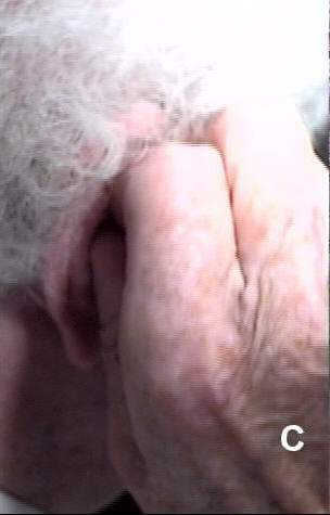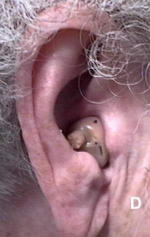 CASE STUDY (CARR0928)This 86 year old female patient was seen for post-dispensing visit one week after the initial fitting of a CLASS II canal hearing instrument to the right ear. A new wearer, the patient presented with a complaint of insecure fit in the ear and acoustic feedback. Figure A (inline image below, 20k) shows that, despite an initial orientation to hearing aid insertion and operation at time of dispensing, the patient was rotating the hearing aid 90 degrees off axis, creating both problems. ![]() Video Oto-Macroscopy (VOM) was used to illustrate dynamically both the correct (Figure B inline image; 20k) and incorrect insertion orientations ![]() In the correct orientation, the patient reported an inability to easily adjust the hearing aid gain control (GC), (Figure C inline image; 14k) previously modified at time of fitting to a double height gain wheel (2W). VOM was used to help the patient locate and manipulate the gain control. ![]() To refine further the gain control operation, a cap 2W gain wheel was installed (Figure D, inline image; 22k) to allow easy adjustment of volume with a two-fingered "watch-winding" motion. At the next post-fitting visit, the patient demonstrated a consistent ability to insert the aid correctly and adjust the gain control with no acoustic feedback or extrusion. ![]() After an additional two weeks, the patient reverted to her previous difficulty with volume control adjustment and a newly developed functional problem with 312 battery insertion. At this time, a decision was made to refit the patient with a CLASS II half-concha instrument having a larger 2W, placed in a higher position on the faceplate, and a 13 battery. (Figure E, inline image; 19k) After a training session using VO for visual feedback, the patient demonstrated a promising facility with insertion, VC adjustment and (13) battery replacement. ![]() |