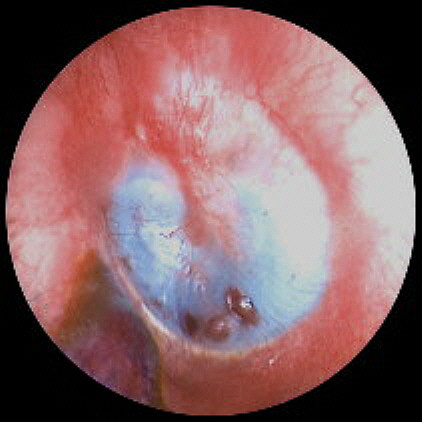 The vivid blue cast visible through the tympanic membrane in Figure 1 is the residual silicone impression material filling the middle ear space in intimate contact with the medial surface of the TM. Injection of the material caused a traumatic inferior perforation of the tympanic membrane and subsequently filled the tympanic cavity. Note the hematoma in anterior inferior auditory meatus, probably traumatically induced by the injection gun tip placement.