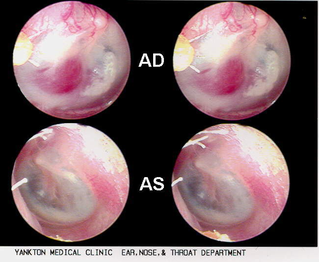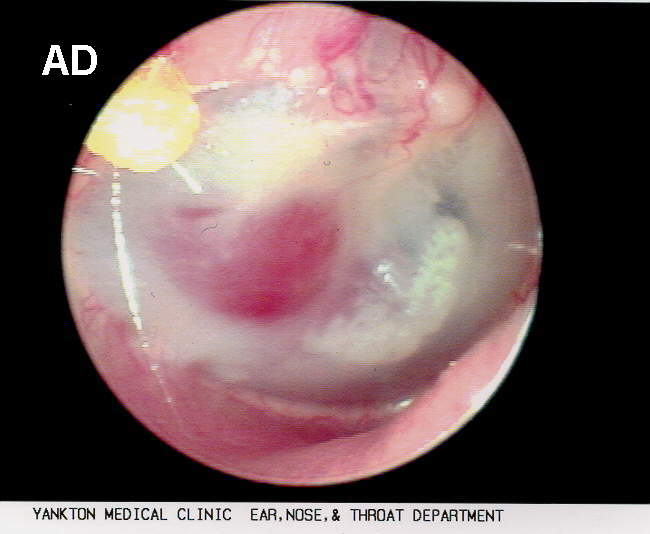 Physical exam revealed a heavily sclerotic right TM with a reddish mass slightly bulging from the central portion of the TM. It appeared to arise from the substance of the TM or perhaps behind the TM. While observing the mass with the VO subtle but discernible pulsations of the mass were apparent.
