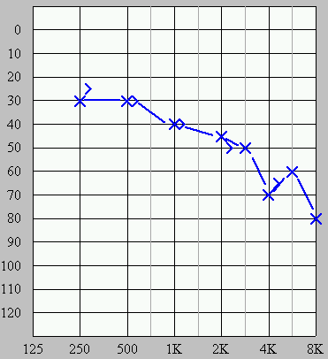 This 83 year old male patient presented with an early childhood history of middle ear disease having a unilateral simple mastoidectomy performed on AS at the age of 5 years. Pure tone audiometry AS (11k) reveals a mild, sensorineural loss of hearing with no significant air-bone gap. Tympanometry AS shows a flattened (Type B) tracing with a minimal peak near ambient air pressure.