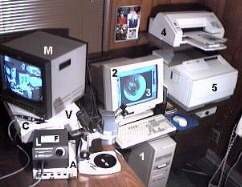 In order to store, edit, recall, compare and print VO images as patient records, it is necessary to provide an interface from the VO analog system to a computer which has been adapted for this purpose.The author's office VO system, containing a full range of analog and digital features, is shown below. Because of the author's clinical text and hypertext publishing requirements, this system transcends the requirements for routine application in a hearing health practice. The digital extension of a VO system is invaluable in a practice where VO is used routinely in patient hearing aid and hearing health follow-up. To date, two companies, Starkey and Lori Labs, provide integrated hardware, software and technical support for computer-based Video Otoscopy in a hearing health practice. Other manufacturers can be expected to offer computer support for VO systems.