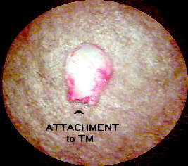 Figures below present two views of the dissected cholesteatoma The pathology report demonstrated a cystic structure with indistinct lining but whose features were consistent with a cholesteatoma. The specimen was 1.5 mm at its pedunculated base, 2.5 mm wide and 3 mm in length.