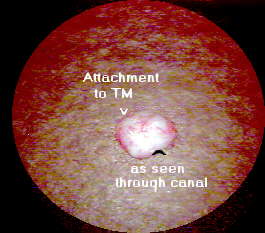Physical examination revealed a smooth, white pearly mass arising from the substance of the tympanic membrane in the posterosuperior quadrant. It did not appear to be extending into the mesotympanum very far, although it was hard to tell and it was directly overlying the ossicles. It was decided to observe the child closely to allow some overall growth of the child so as to make surgical removal technically easier. Since these tend to grow fairly slowly, the child was scheduled to return in 3 months to monitor the size of the cholesteatoma. The child was subsequently seen in mid November when it was decided to undertake surgical removal. The VO picture below was taken on November, 2 weeks prior to surgery.