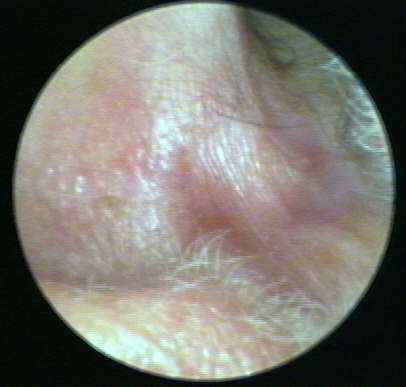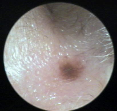 The patient is a 75 year old semi-retired physician known to the practice for 17 years. Wearing binaural hearing aids for that same period, he was seen for a service visit to replace a battery compartment on a two year old CIC instrument AD. Routine VO examination of both ears revealed a suspicious discoloration on the floor of the AD concha (below). The lesion was NOT present at time of a routine service visit 6 months earlier. A Polaroid photograph was provided to the patient with a referral for dermatological consultation.
