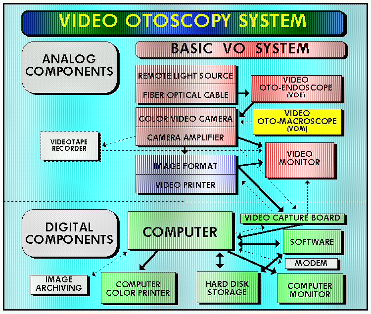 The video / analog components described in he following paragraphs are fundamental to the implementation of a video otoscopy system in a hearing health practice. These systems may be categorized as Basic; (i.e. on-line video otoscopy only) and Enhanced VO with options for freeze-frame, multiple hard copy image reproductions, image formatting and oto-macroscopy.