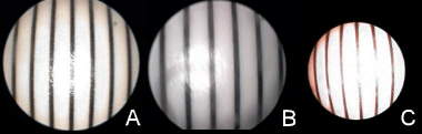 Fig. 6. Variability (A-C) in luminance levels, image size and spherical aberration among three different video rod endoscopes.