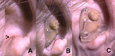 Fig. 8. Video oto-macroscopy (VOM) application: (A) ulceration of medial antitragus induced by contact with canal aid faceplate / battery compartment. (B) Result after grinding back contact areas, pressure improved but aid extrudes causing slit leak / feedback. Dashed line provided as a VO photo reference for laboratory shell technician to fabricate antitragal lip (ATL). (C) ATL stabilizing aid, spreading pressure and eliminating extrusion-based feedback.