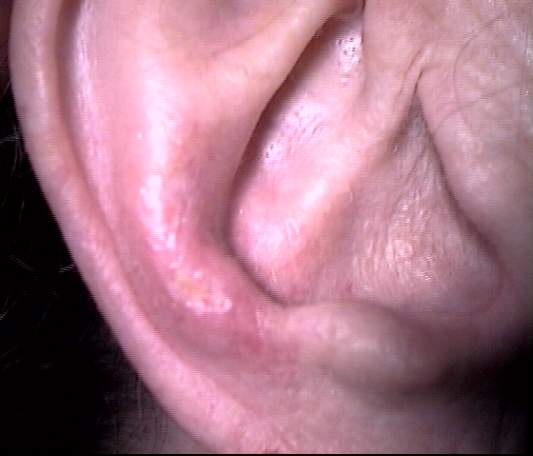 This 78 year old female patient, having a mild, bilateral SNHL, has been known to the practice for fifteen years. She presented with a chief complaint (cc) of otalgia AD and an inability to fully insert her four year old Class II (vented; 2mm internal diameter) canal hearing aid. Visual / Video Oto-Macroscopic (VOM) examination of the pinna revealed two lesions of the helix and antihelix, respectively [inline image below (29k)]. The lower, healing, abrasion was self-induced with a fingernail. The mid-anti-helical lesion, nodular, hyperaemic and painful to the touch, was diagnosed by her dermatologist as chondrodermatitis nodularis helicis (CNH). The mid-nodular scab was the site of intralesional cortisone injections.