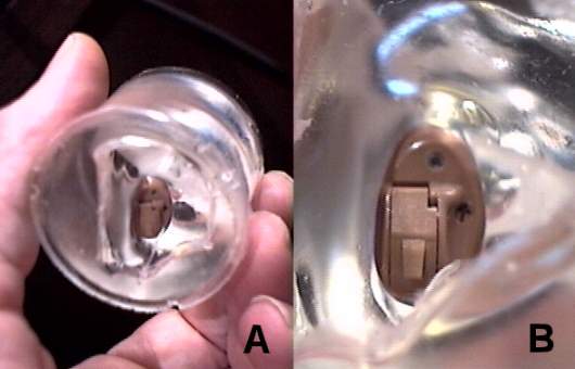 Counseling a CIC patient on the proper insertion technique can be enhanced significantly by use of a transparent investment. Traditionally made of an opaque material, the clear silicone investment allows a well-lighted VOM (video oto-macroscopic) representation to the patient of the instrument's appearance in situ (Figure A, inline below; A+B=21k). The faceplate may be clearly demonstrated in VOM close-up highlighting the microphone port, set screw volume control (SVC), battery compartment, vent and extraction tab(Figure B).