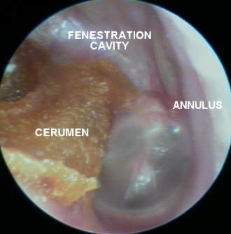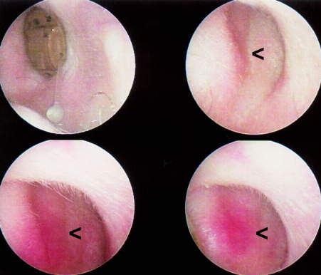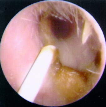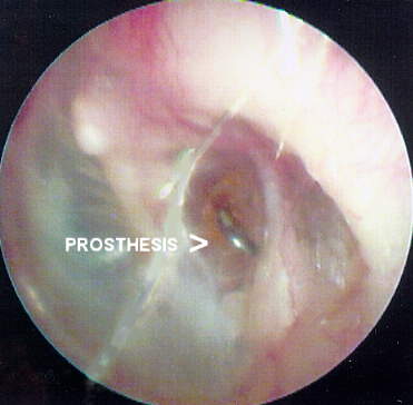 Figure 5 represents the left ear of a long-term patient seen for a periodic hearing aid follow-up evaluation after a two year interval. The ear had an unsuccessful stapedectomy 30 years ago. The incudal head of the wire prosthesis has recently begun to extrude through an anterior monomeric scar in the TM. On referral, the consulting ENT recommended monitoring but specified no course of treatment.