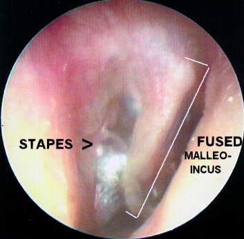 Figure 4 presents a congenitally fused, hypertrophic malleo-incudal complex resulting in an 65 dB conductive overlay. The condition was ruled inoperable during exploratory tympanotomy because of facial nerve anomalies within the middle ear space.