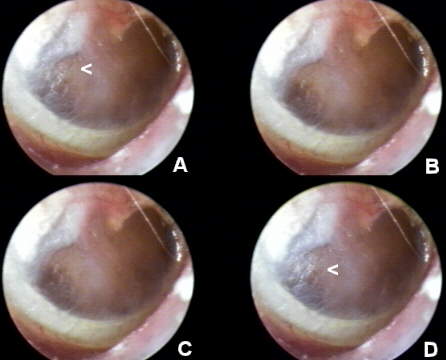 Figure 6 demonstrates the VO strobe feature, which permits a time-based series of images can be sequenced automatically in a "golf swing" analysis. It is useful in viewing the effects of a Valsalva or Toynbee manuever at the TM. In this particular case, the 75 year old female patient was referred by a PCP with chief complaints of chronic hearing loss and an intractible "clicking" tinnitus on the right ear (AD). While the pure tone audiogram revealed a 45 dB, sloping, mixed, essentially sensorineural loss of hearing with an unremarkable (Type A) tympanogram, VO provided a probable etiology for the tinnitus. Examination of the TM at close range revealed an absent manubrium mallei and, posteriorly, a long process of a displaced incus which, because of an hyperpatulous eustachian tube, would intermittently make contact with the TM, functionally coinciding with the "click". Two ENT physicians and an MRI ruled out cholesteatoma an alternative diagnosis. The VO strobe sequence shows the effect of a single nasal respiratory cycle (A-D) on the TM. The patient had unconsciously developed a compensatory mouth-breathing strategy. The intermittent contact can be seen in the area of a posterior, inferior monomeric scar. A (1 mm) vented canal aid was prescribed for the affected ear, providing both hearing help and environmental masking of tinnitus.