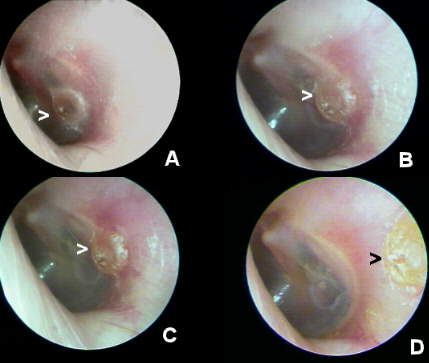 Figures 7a-d shows a sequence of VO records documenting the impact of an ENT-performed office myringotomy of the TM for an acute serous otitis media [SOM] in 70 year old pediatrician. To promote TM healing, the ENT applied phenol to the edges of the paracentesis in order to promote healing and closure. Figure 7A shows the resulting cicatrice as it appeared within 48 hours of the procedure. Note, in Figures 7B-D,the antero-lateral movement of the phenolized TM epithelial layer cicatrice with the normal lateral squamous epithelial migration. The presence of a residual circular keratinization of the medial TM layer at the initial site of incision can be observed, over the sequence, to be non-migratory. The (physician) patient, ENT and PCP were all duly impressed and grateful to be apprised of the clinical case status with this level of clinical documentation. The patient was successfully fitted with a completely-in-canal (CIC) hearing instrument in the noninvolved ear.
